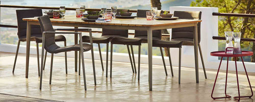 Core chair upholstered with Cane-line SoftTouch®. The Core chairs are made from weather-resistant Cane-line SoftTouch® with Quick Dry system. The upholstered chairs are the epitome of comfort, while details on the armrests reveal their designer pedigree. The chair is stackable and has been specifically designed for the Core table, but alternative chairs can certainly supplement the stylish table.