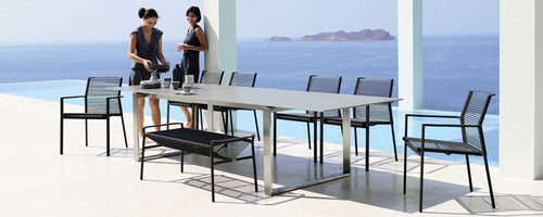 The Edge series designed by Strand+Hvass offers a completely new style in the Cane-line's assortment. With it's transparent rope weaving and minimalistic aluminium frame, it will blend in many places, yet stand out as a contemporary and practical outdoor furniture. Further, the comfort of the Edge series is high both in terms of sitting comfort and usability. Rope excels with a nice feel-and-touch and dries fast after a rain shower. The Edge series is produced by use of casted aluminium parts designed for optimal aesthetics and strenght. The Edge Series fits exceptionally with the Edge extension tables and the bench can be used as two extra seats at the end of the table. The highback chair is the ideal relaxing chair and used together with an On-the-move sidetable, one has a comfortable and maintenance easy solution. The Edge series represents a style that works both indoor as well as outdoor settings.