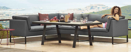 Flex dining lounge is a modular system that is perfect for outdoor use. Flex can be used as an ordinary lounge sofa for lounging about in, or for a more upright seating position suited for dining. Its unique, versatile design makes Flex multi-functional: a relaxing lounge group as well as a dining area where you can sit and eat. Flex is available in weatherproof Cane-line Tex® with soft, comfortable cushions in Cane-line Natté. The cushions and materials are easy to maintain and come with the Cane-line QuickDry system, which is a special technology for added comfort and ensures that the cushions dry soon after a downpour.