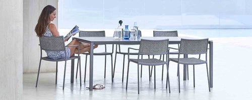 The Less chair is simple and stylish with its slim, powder coated aluminium frame with seat and back in grey Cane-line Natté fabric with QuickDryFoam®, or in the unique, weather-resistant Cane-line Weave® in lava grey or white, or in the elegant French cane version.