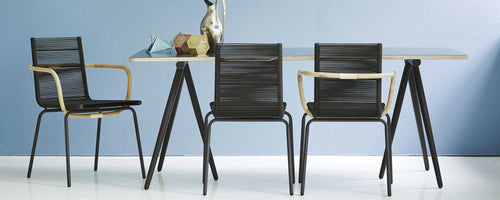 The design team Johannes Foersom & Peter Hiort-Lorenzen MDD has created a new series of chairs with a light and simple frame. The steelframe and the strong Cane-line Rope fiber is a perfect match, combined with a natural armrest in rattan to give raw detail.