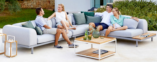 Space is a lounge concept in a modern and Scandinavian design. The concept adds a new dimension to modular lounge sofas where one is capable of changing materials and functions and thereby the look. Space can stand as a lounge sofa, but one can also change the back and side modules into tables, so the lounge sofa can even change into a sunbed. The table plates are of either certified teak or solid surface material, the fabric is the soft and comfortable Cane-line AirTouch. This innovative and contemporary lounge concept is designed by the Danish design duo Foersom & Hiort-Lorenzen MDD.